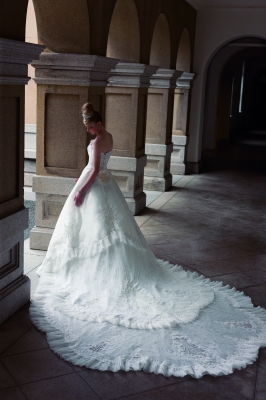 ロイヤルスタイルのウェディングドレスにソフトで清楚なイメージを素材感でプラス。空にうすく広がるやわらかい雲の様なレース使いのやさしいロングトレーン。