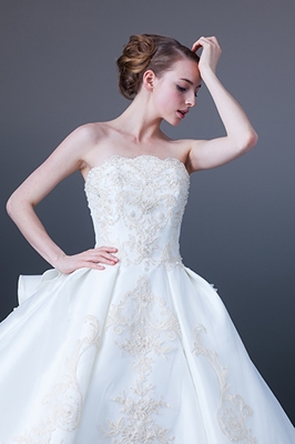 最新作として登場したカノン、豪華なロングトレーンと素晴らしいゴールド刺繍、ふんだんに使用したオーガンジー生地のフリルフラワー、どこをとっても申し分ない豪華さで大人気の兆しあり!是非お早めにお問合わせ下さいませ。