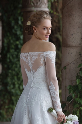繊細な総レースが美しいセットのオフショルダースリーブと、優美なふんわりトレーンはドレスと別の仕立てとなるので、4パターンの着こなしが楽しめます。 -