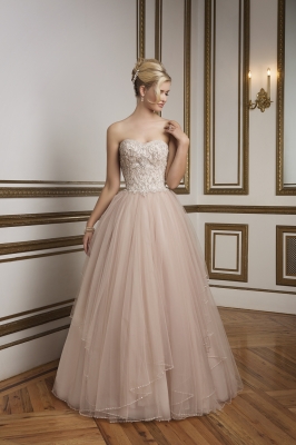 光沢のある生地と長めに作ったトレーンがゴージャスな一着。 淡い色味でもはっきりとした発色なので、ナチュラル系でもしっかりした存在感が。 さらにビスチェ部分を白いレースで覆い、可憐なイメージをプラス…