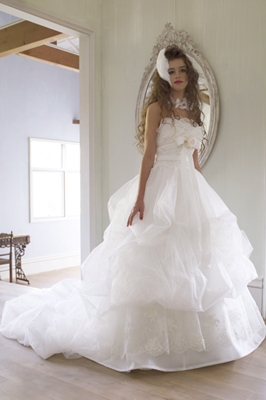 ゴージャスな刺繍を施した胸元とヨークのリバーレースがノーブルなイメージを演出したドレス。サテンツイルのタッキング、チュールエンブロイダリーレースの繊細さ、グラッシャーの透明感がバランスよくマッチしてい…
