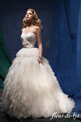ワンショルダーはとりはずし可能。ベルトは白です。人気の女の子らしいハートカットと軽やかな印象の2種類のシルクオーガンを重ねた豪華でボリューミィなスカート。あえて飾りを排除することで、甘すぎず綺麗な印象に…