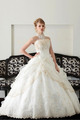 ゴールドの輝きがゴージャス感を漂わせるエンブロイダリーレースにビーズの刺繍加工を施したマリエ。柔らかな表情を見せる花とフリルが華やかなバックスタイルを作ります。 レースのチョーカーにネックレスを重ねて、衿元もエレガントに・・・。