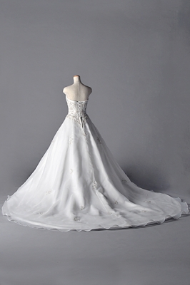 立体的な刺繍を施したトップスが引き立つシルエットの綺麗なAラインドレスです。 珍しいハートカップの折り返しサテンも、バストとフェイス周りを美しく魅せます。 厳選されたオーガンジーサテンがを使用しているため、柔らかくも光沢のある透け感が実現。