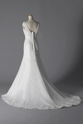 オフショルダーのソフトマーメードライン。 透け感のあるオフショルダーがお顔や肩回りを優しい印象に。 柔らかく上質な総レースを使用しているため、品のある女性美を引き出します。 デザイン性の高いソフトマーメードラインに仕上げました。